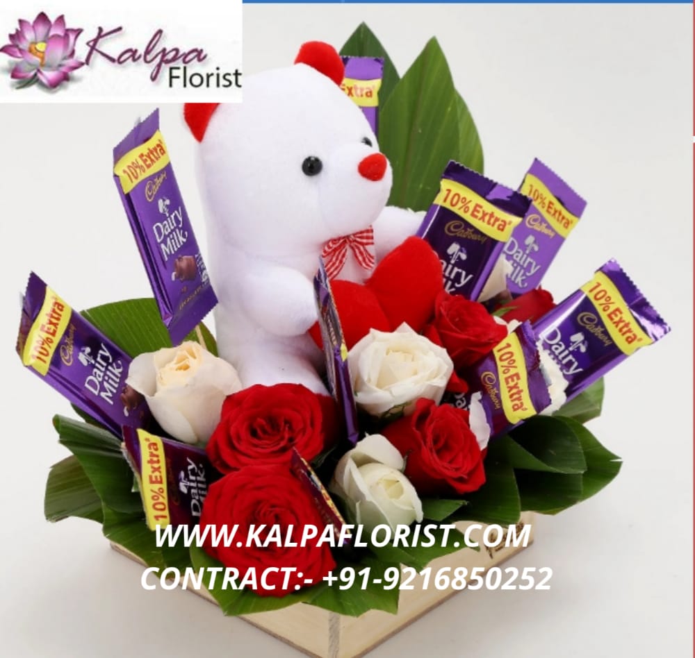 Want to surprise your loved ones with a special gift hamper? Be it their birthdays or any other occasions, you can present this hamper to show your love. It contains a cute teddy bear, white and red roses and cadbury dairy milk chocolates in a cane basket.